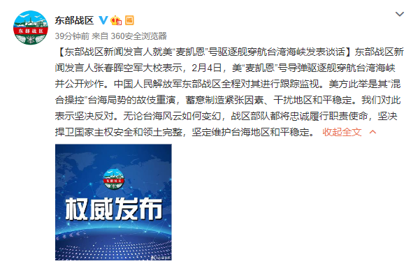 中國臺灣網2月4日訊 東部戰區新聞發言人張春暉空軍大校表示,2月4日,美“麥凱恩”號導彈驅逐艦穿航臺灣海峽并公開炒作。中國人民解放軍東部戰區全程對其進行跟蹤監視。