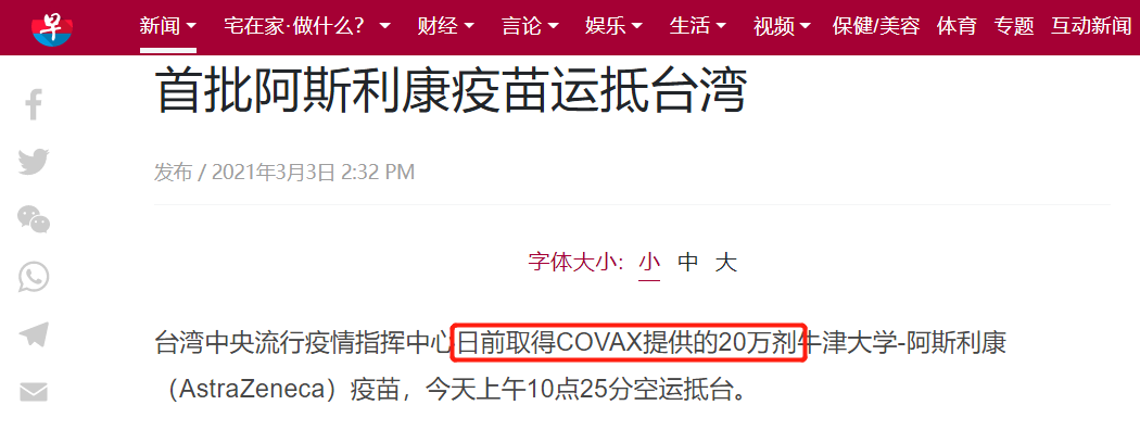 除了疫苗來源外,該消息的另一個爭議點則是首批抵臺疫苗的總數。新加坡《聯合早報》的報道中沿用了疫苗來自COVAX平臺的說法,并表示這批疫苗的總劑量是20萬劑,而不是臺灣“中央社”和RFI所寫的11.7萬劑。