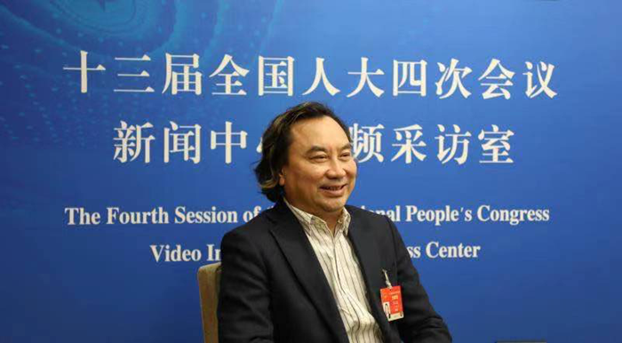 圖為福建省臺聯會長江爾雄委員。全國政協十三屆四次會議新聞中心網絡視頻采訪間供圖