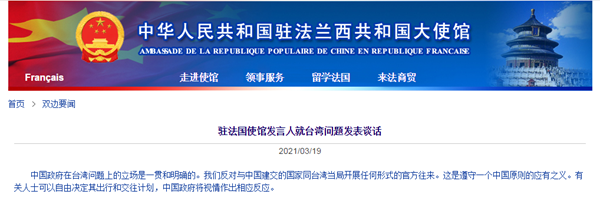 中國臺灣網3月22日訊 日前,中國駐法國使館發言人就臺灣問題發表談話。發言人表示,中國政府在臺灣問題上的立場是一貫和明確的。我們反對與中國建交的國家同臺灣當局開展任何形式的官方往來。這是遵守一個中國原則的應有之義。有關人士可以自由決定其出行和交往計劃,中國政府將視情作出相應反應。
