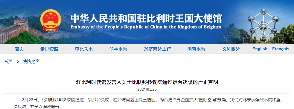 海外網3月27日電 據中國駐比利時王國大使館網站消息,3月26日,比利時聯邦參議院通過一項涉臺決議,在臺灣問題上說三道四,為臺灣當局企圖擴大“國際空間”鼓噪,我們對此表示強烈不滿和堅決反對,并予以強烈譴責。