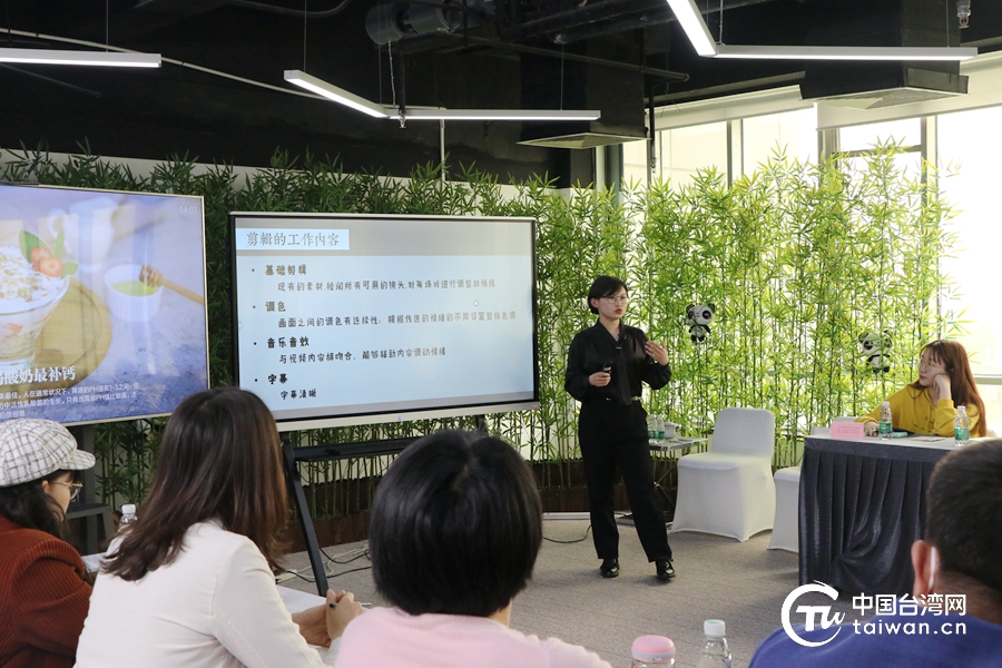 4月25日,由中國臺灣網舉辦的海峽兩岸古風茶裳直播季·臺青電商培訓進行中。圖為發條學社C00、新媒體電商資深從業者夏夢琪講解如何打造爆款短視頻。(中國臺灣網 張亞靜 攝)
