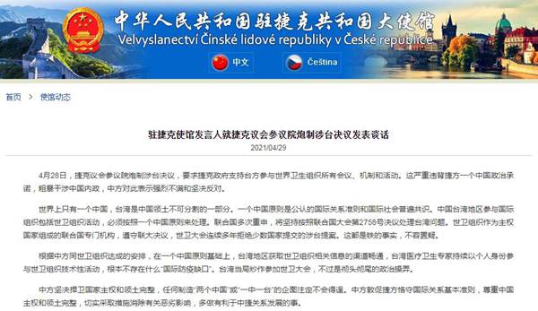 駐捷克使館發(fā)言人29日就捷克議會(huì)參議院炮制涉臺(tái)決議發(fā)表談話。