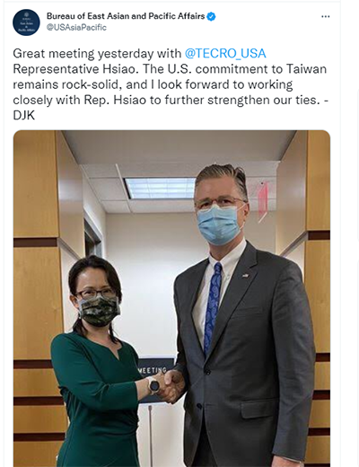 美國國務(wù)院有關(guān)社交媒體賬號(hào)高調(diào)發(fā)布副國務(wù)卿費(fèi)爾南德斯、亞太事務(wù)助卿康達(dá)與蕭美琴見面的照片及貼文。(美國國務(wù)院有關(guān)社交媒體賬號(hào)截圖)