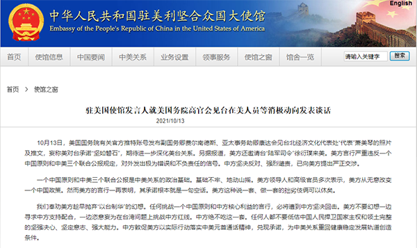 中國駐美使館發(fā)言人就美國務(wù)院高官會(huì)見臺(tái)在美人員等消極動(dòng)向發(fā)表談話。(中國駐美大使館官網(wǎng)截圖)