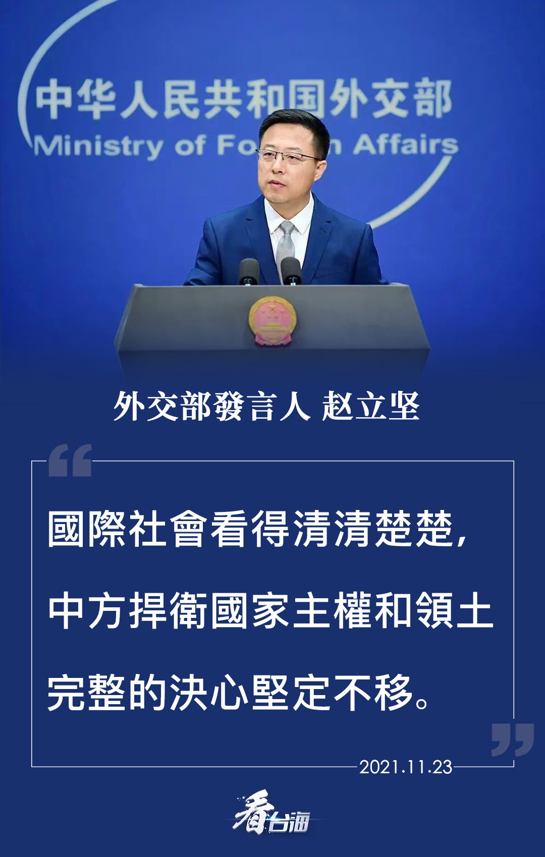 中國在臺灣問題上的原則立場已經闡述得非常清楚,正如外交部發言人趙立堅23日再次強調的:中方捍衛國家主權和領土完整的決心堅定不移。也正如中國人民解放軍一直以來所行動的:將采取一切必要措施,堅決反制一切威脅挑釁,堅決捍衛國家主權和領土完整。奉勸美方立即糾正錯誤,停止打“臺灣牌”,多為地區和平與穩定發揮建設性作用,倘若一再在臺海尋釁滋事,中國人民解放軍必將讓其付出代價。(據中央廣播電視總臺臺海之聲)
