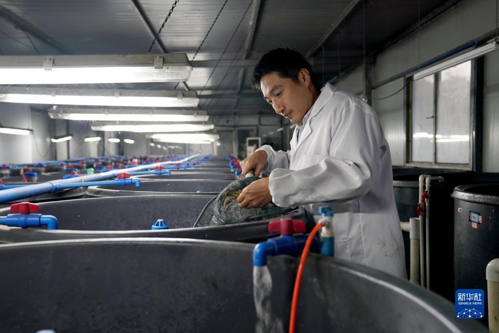上海海洋大學吳旭干教授在查看種蟹狀況(11月25日攝)。新華社記者 劉穎 攝