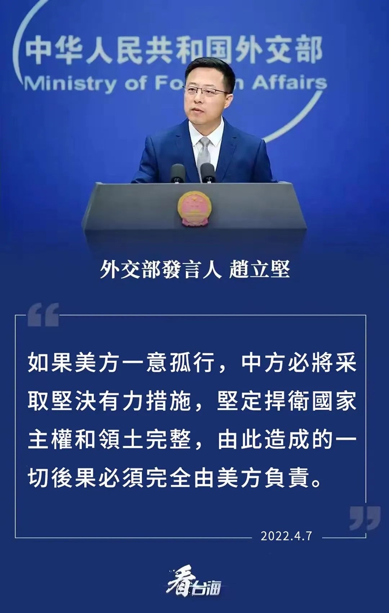 現階段,“遏制中國”已經成為一些美國政客的病態心理。為了對抗中國,這些政客不顧道義、不顧臉面,只要是不利于中國發展之策,就被他們爭相使用,其中打“臺灣牌”就是他們慣用的伎倆。佩洛西此次策劃竄訪臺灣就是打“臺灣牌”中事態比較嚴重的一種,向“臺獨”分裂勢力發出了嚴重錯誤信號。但他們顯然打錯了算盤,面對美方的種種挑釁,中方絕不會坐視不管。正如外交部發言人趙立堅4月7日強調的,如果美方一意孤行,中方必將采取堅決有力措施,堅定捍衛國家主權和領土完整,由此造成的一切后果必須完全由美方負責。