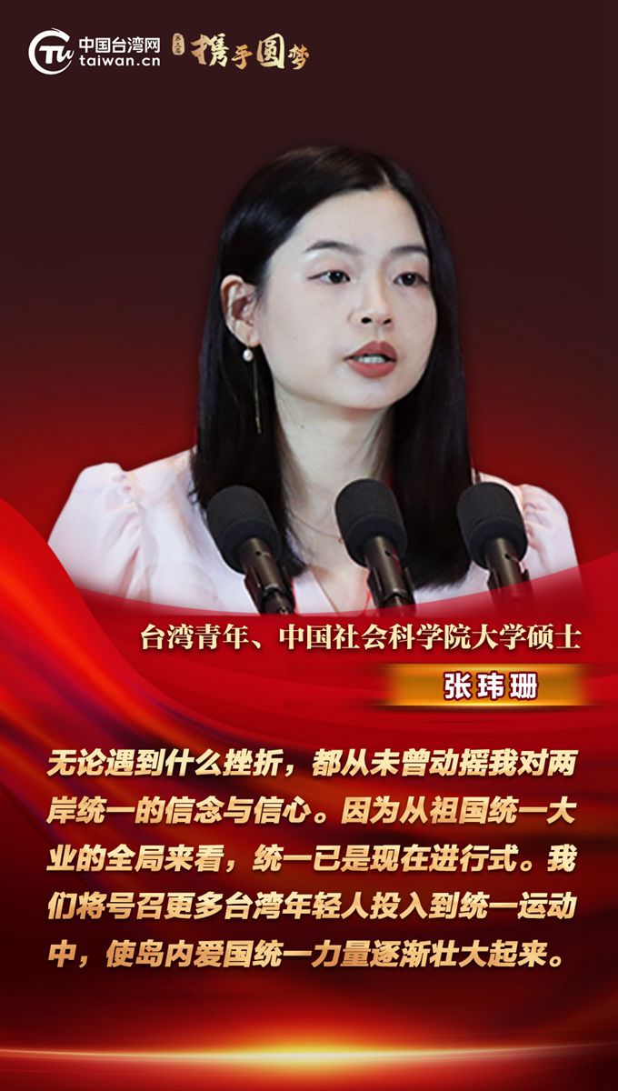 第三屆“攜手圓夢——兩岸同胞交流研討活動”7月25日在南京開幕。臺灣青年、中國社會科學院大學碩士張瑋珊在致辭時表示,無論遇到什么挫折,都從未曾動搖我對兩岸統一的信念與信心。因為從祖國統一大業的全局來看,統一已是現在進行式。我們將號召更多臺灣年輕人投入到統一運動中,使島內愛國統一力量逐漸壯大起來。