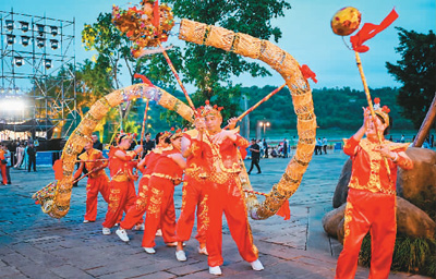 在四川宜賓,演員在“三江映明月 天涯共此時”海峽兩岸中秋音樂晚會上舞草龍迎佳節。