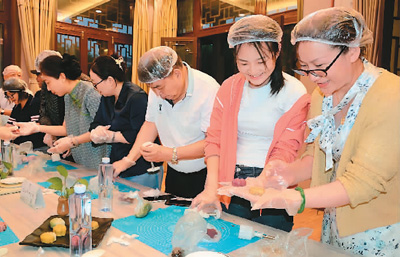 “清泉邀月明 碧荷融桃實”兩岸山東鄉親中秋聯誼會上,臺胞臺屬相聚一堂,體驗月餅制作。