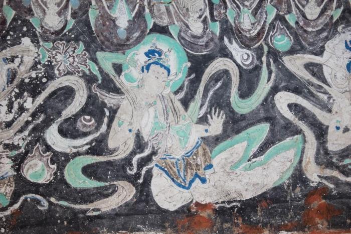 10月12日,兩岸合辦的《妙音莫高──敦煌樂舞專題展》在線上開展。圖為展覽中呈現的敦煌榆林窟中的飛天樂伎。敦煌研究院供圖