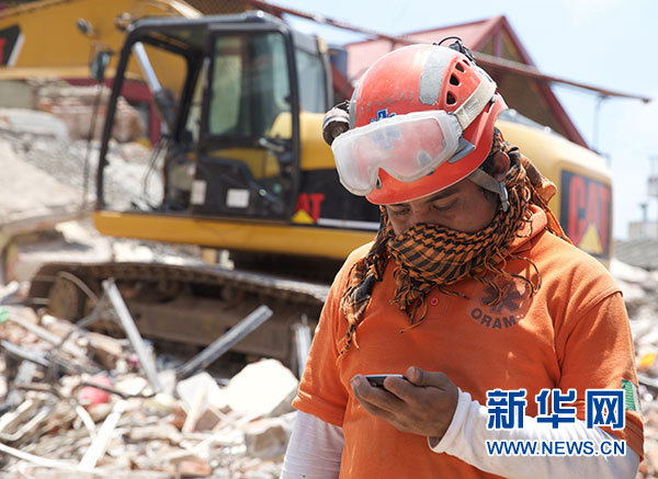 9月9日,在墨西哥瓦哈卡州胡奇坦,一名搜救人員在搜救工作間隙查看手機。根據墨西哥政府發布的最新數據,截至9日晚,墨西哥地震遇難人數已上升至90人。墨西哥軍方和國防部開始向受災最嚴重的瓦哈卡州胡奇坦增派救援人員,為當地民眾提供人道援助。新華社記者淡航攝