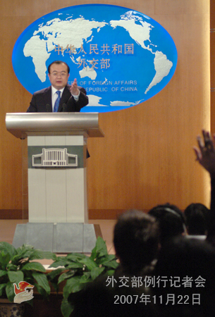 2007年11月22日,外交部發(fā)言人劉建超舉行例行記者會,就中印聯(lián)合軍事訓(xùn)練、中東問題國際會議、達爾富爾問題、氣候變化等答記者問。