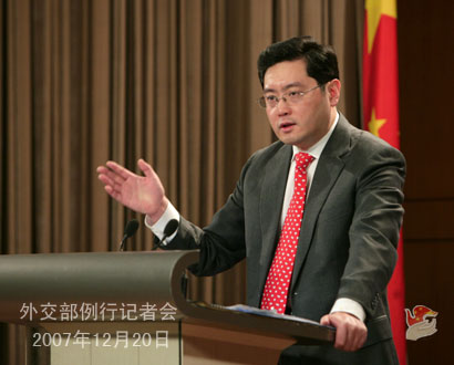 2007年12月20日下午,外交部發言人秦剛舉行例行記者會,就朝鮮半島核問題、李明博當選韓國新一屆總統、日本福田首相訪華、中印聯合反恐訓練、緬甸問題等回答記者提問。