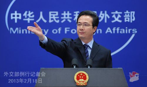 2013年2月18日,外交部發言人洪磊主持例行記者會。