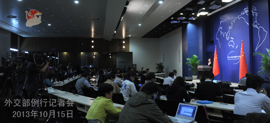 2013年10月15日,外交部發言人華春瑩主持例行記者會。