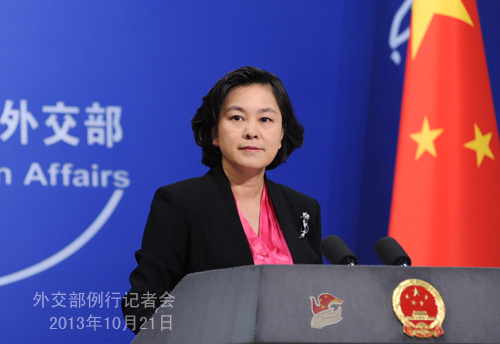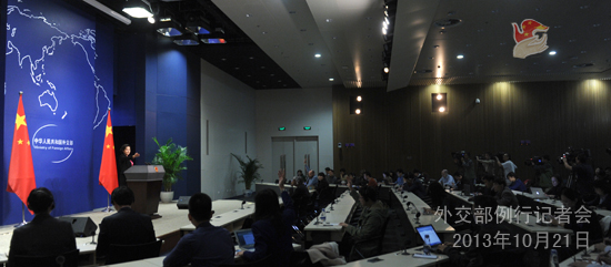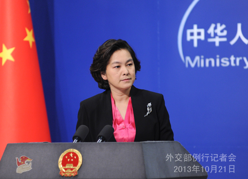 2013年10月21日,外交部發言人華春瑩主持例行記者會。