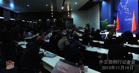 2013年11月18日,外交部發言人秦剛主持例行記者會。