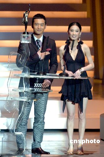 資料圖:4月15日晚,第二十六屆香港電影金像獎頒獎典禮正在香港文化中心舉行,內地影星黃曉明、黃圣依出席頒獎典禮晚會并擔任頒獎嘉賓。中新社發 鄧慶樂 攝