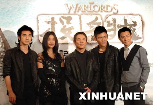 12月10日,電影《投名狀》演員金城武、徐靜蕾、李連杰、向左、劉德華(由左至右)在新聞發布會上合影。