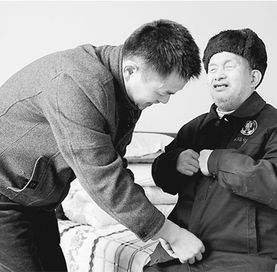 黃輝(左)在為患有眼疾的彭永富老人穿衣。