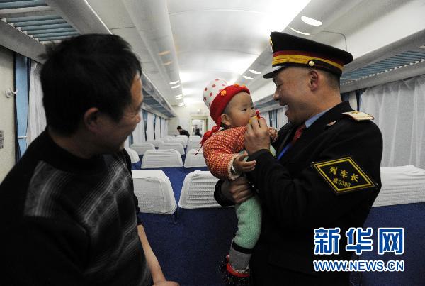 2月2日晚,列車長陶然抱起1歲2個月大的黃心怡,哄她早點入睡。農歷大年三十,是中國人全家團聚辭舊迎新的時刻,但依然有一些人因為工作等原因,不得不在旅途中度過除夕夜。2日晚,記者踏上由成都開往貴陽的K9517次列車,在列車上與返鄉的106名旅客和50名工作人員一同度過了一個難忘的年三十。與春節前列車滿員的情況相比,年三十可以算是春運開始后最輕松的一天,但列車長陶然卻并不輕松。從大學畢業開始,他已經在鐵路系統工作了18年,今年是他在列車上度過的第8個除夕夜。為了讓旅客們在列車上過好年,陶然和列車員們盡可能提供貼心周到的服務,并給大家送上了新年小禮物和節日的問候。陶然告訴記者:“只要列車上還有一名乘客,我們都沒有輕松的時候!丶摇沁@列火車上每個人都期盼的事情,我們要讓旅客在歸途中感受到家的氛圍”。新華社記者 陳誠 攝