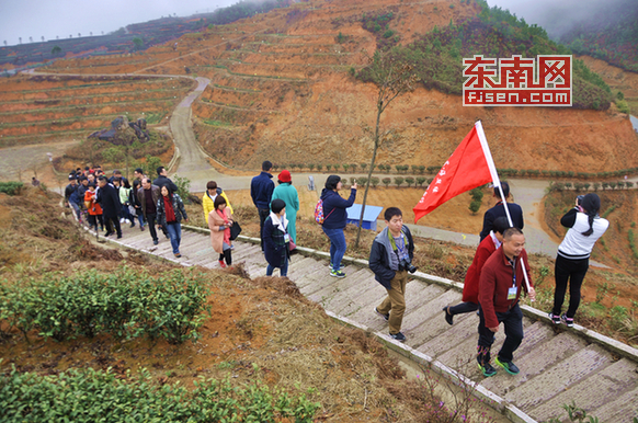 圖為采訪團(tuán)一行走進(jìn)張?zhí)旄I鷳B(tài)茶場(chǎng)。葉伏國(guó) 攝
