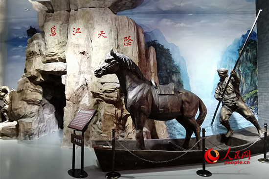 當(dāng)年為幫助紅軍渡過烏江,漁民周世昌便用小木船給紅軍渡戰(zhàn)馬。圖為周世昌劃船渡戰(zhàn)馬雕塑。 人民網(wǎng)記者 黃玉琦攝