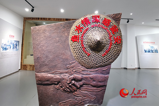 “一只手代表的是甕安人民,一只手代表的是紅軍,在斗笠之下,兩只手緊緊相握,體現(xiàn)的正是魚水深情。”紀(jì)念館講解員指著“魚水情深感甕安”的雕像說。圖為“魚水情深感甕安”雕塑。人民網(wǎng)記者 黃玉琦攝