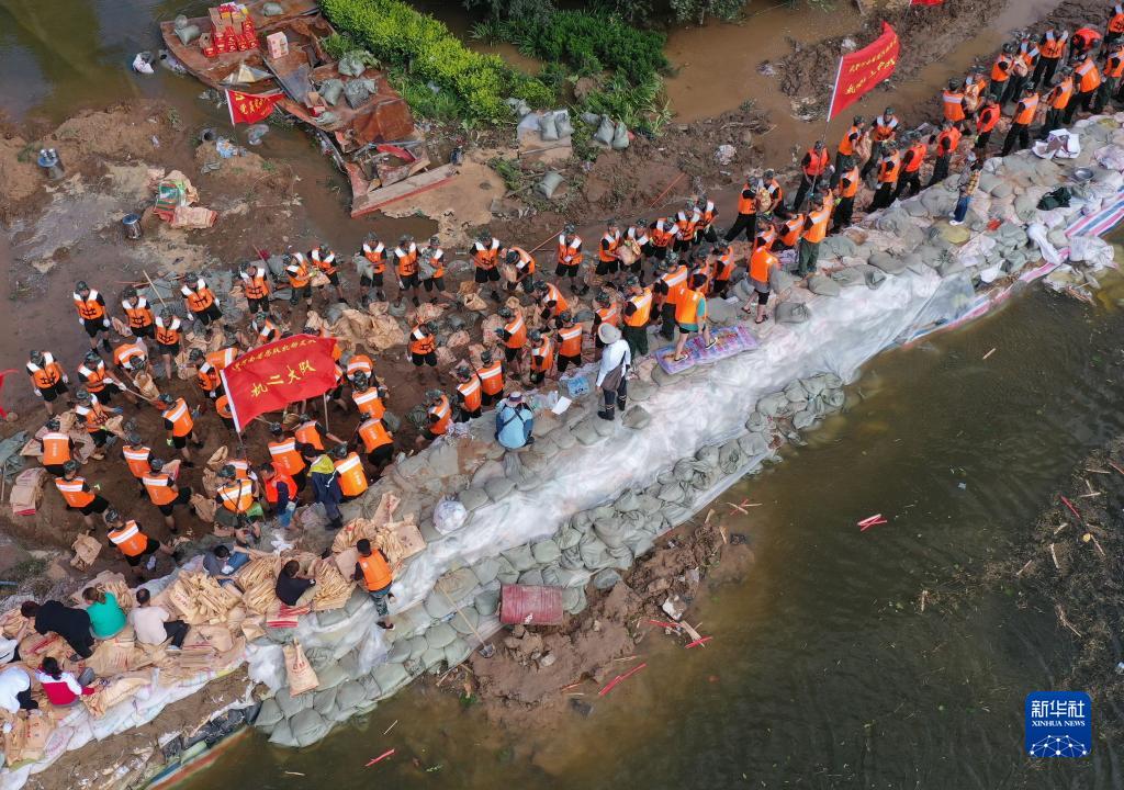 救援人員在河南省鶴壁市浚縣傅莊堤上搬運沙袋,加固大堤(7月29日攝,無人機照片)。新華社記者 李安 攝