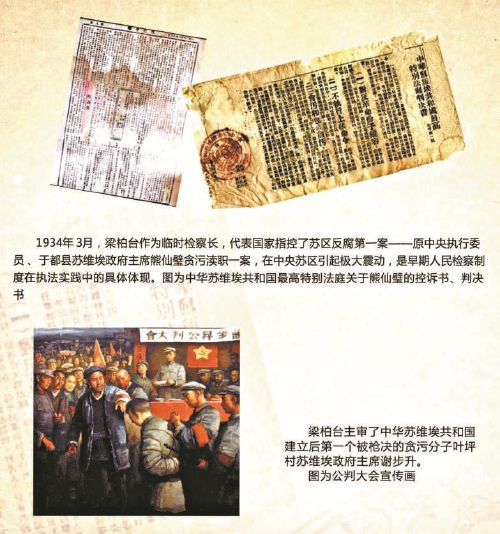 梁柏臺,1899年出生于浙江省新昌縣,1922年進入莫斯科東方大學學習,同年加入中國共產黨。1931年從蘇聯回國,被派往中央蘇區參與建設中華蘇維埃共和國紅色政權。到紅都瑞金后,梁柏臺參與中華蘇維埃第一次全國代表大會文件起草,執筆起草了《中華蘇維埃共和國憲法大綱》。同時,還主持起草了《革命法庭條例》《看守所章程》《中華蘇維埃共和國司法程序》等十多部法律法規。梁柏臺還先后擔任臨時政府司法委員會委員、司法人民委員部副部長和部長、最高法庭(院)委員、臨時檢察長等職,是紅色政權的第一位檢察長。1935年3月在江西大余犧牲。梁柏臺是中華蘇維埃共和國法制建設的領導者之一和法律主要制定者,是人民司法的開拓者,其倡導的公開審判、巡回法庭、人民調解等制度,為新中國司法制度的創立發展提供了重要經驗啟示。