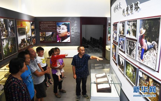 毛相林(右一)在下莊精神陳列館內講述當年修路的故事(2020年7月3日攝)。新華社記者 王全超 攝