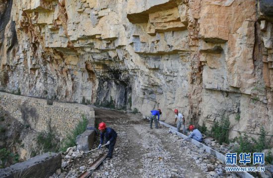 參與修路的下莊村村民在懸崖峭壁上打炮眼(資料照片)。新華社發