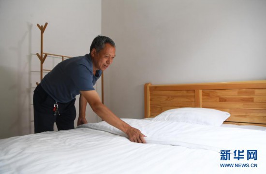 57歲的下莊村村民楊元鼎在自家開辦的民宿內整理床鋪(2020年7月3日攝)。新華社記者 王全超 攝