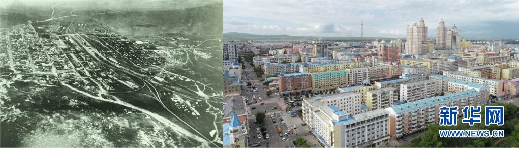 這是一張拼版照片,左圖為20世紀30年代滿洲里的航拍圖片;右圖為2020年8月26日拍攝的滿洲里城區(達日罕攝,無人機照片)。新華社發