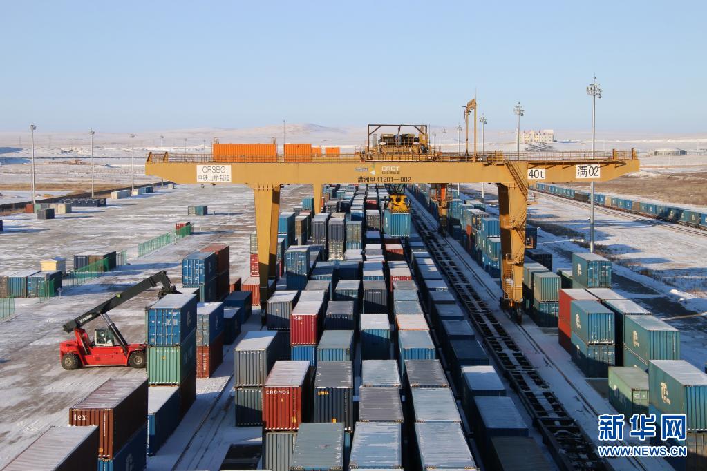 滿洲里站集裝箱場龍門吊進行班列集裝箱換裝作業(2021年1月28日攝)。新華社發(果乃輪 攝)