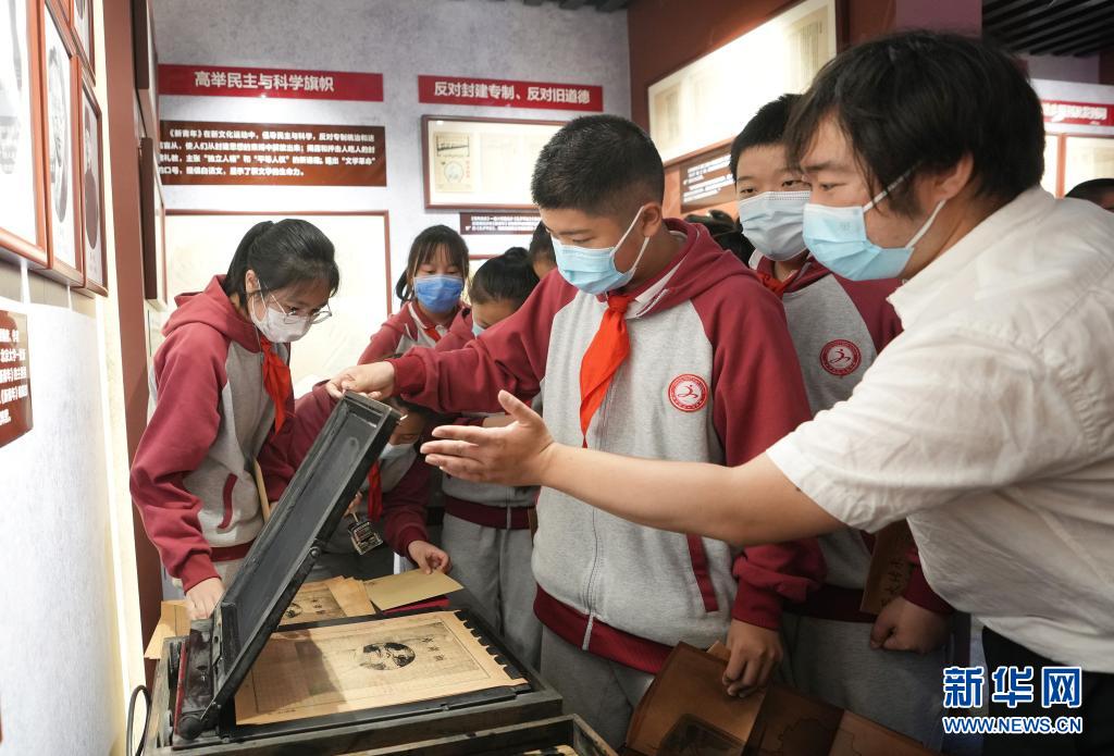 6月1日,北京市第二十七中學學生在《新青年》編輯部舊址(陳獨秀舊居)了解展出的油印機。新華社記者 鞠煥宗 攝