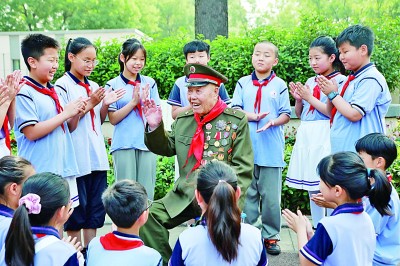 王占山(中)在為河南安陽三官廟小學的少先隊員講戰斗故事。