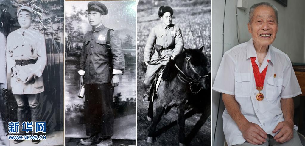 拼版照片:左一、二、三圖為朱亞的老照片(受訪者提供),右一圖為7月24日,朱亞在浙江嘉興的家中(新華社記者劉穎攝)。新華社發