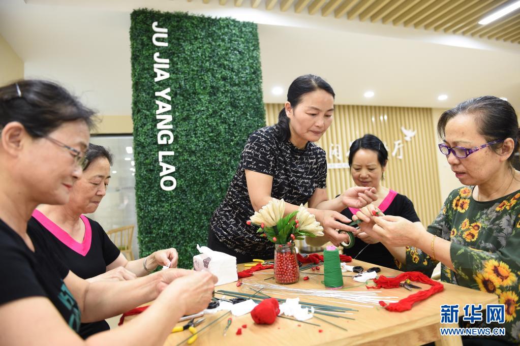 在嘉興高照街道居家養老服務中心,志愿者(中)帶著老人們做手工(8月3日攝)。新華社記者 翁忻旸 攝