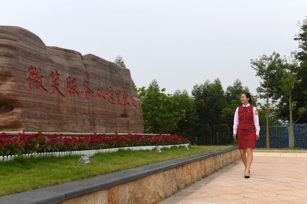 在廣西交通投資集團南寧高速公路運營有限公司南寧東收費站,農鳳娟從辦公樓外一塊刻有“微笑服務從這里出發”的巨石前走過(8月6日攝)。新華社記者陸波岸攝