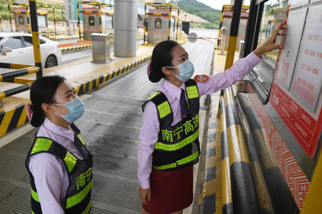 在廣西交通投資集團南寧高速公路運營有限公司南寧東收費站,農鳳娟(右)在檢查有關服務提示張貼情況(8月6日攝)。新華社記者陸波岸攝