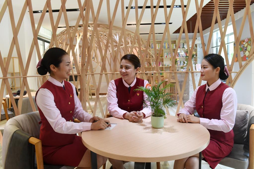 在廣西交通投資集團南寧高速公路運營有限公司南寧東收費站職工書屋,農鳳娟(左一)在和同事談心(8月5日攝)。新華社記者陸波岸攝