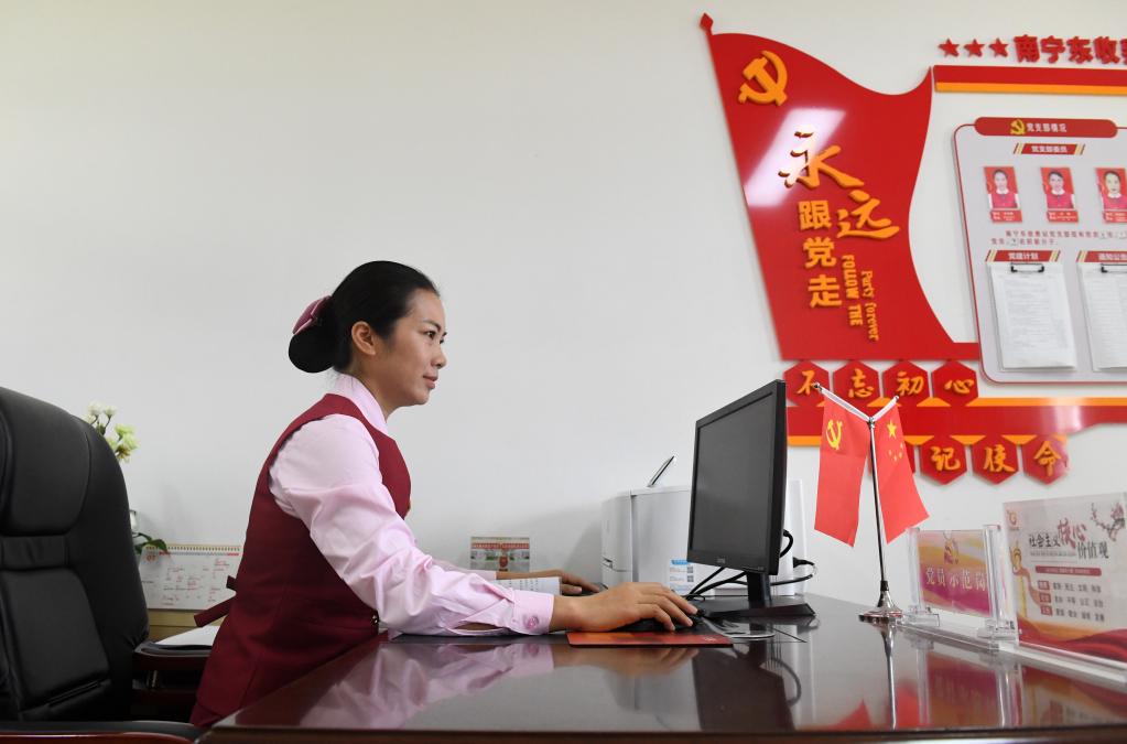 在廣西交通投資集團南寧高速公路運營有限公司南寧東收費站辦公室,農鳳娟正在辦公(8月6日攝)。新華社記者陸波岸攝