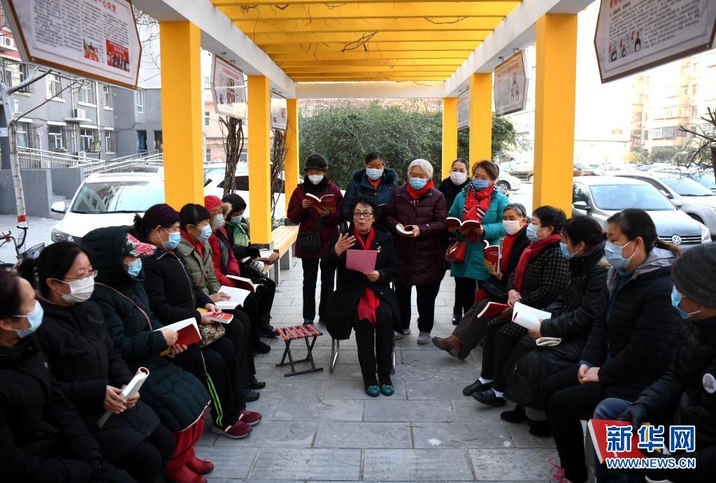 2020年12月22日,河北省石家莊市裕華區建南社區年過八十的黨員靳國芳為社區居民宣講黨的十九屆五中全會精神。新華社記者 王曉 攝