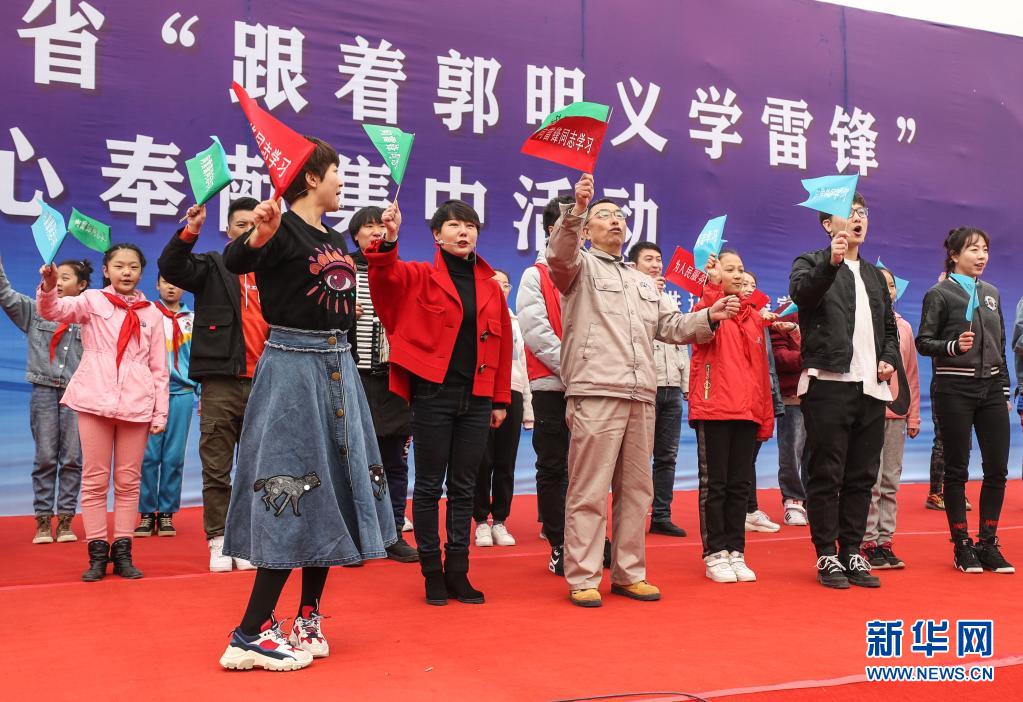 2019年3月5日,在遼寧省葫蘆島市文化廣場舉行的遼寧省“跟著郭明義學雷鋒”愛心奉獻集中活動現場,郭明義(前排中)與志愿者合唱《學習雷鋒好榜樣》歌曲。新華社記者 潘昱龍 攝