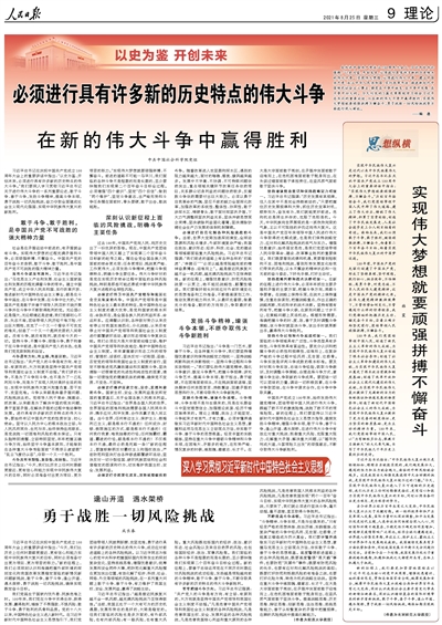 在慶祝中國共產黨成立100周年大會上,習近平總書記強調:“以史為鑒、開創未來,必須進行具有許多新的歷史特點的偉大斗爭!睂崿F偉大夢想,必須進行偉大斗爭。建立中國共產黨、成立中華人民共和國、實行改革開放、推進新時代中國特色社會主義事業,都是在斗爭中誕生、在斗爭中發展、在斗爭中壯大的。今天刊發的3篇文章圍繞學習領會習近平總書記的重要論述,從在新的偉大斗爭中贏得勝利、實現偉大夢想就要頑強拼搏不懈奮斗、勇于戰勝一切風險挑戰等方面進行深入闡述。