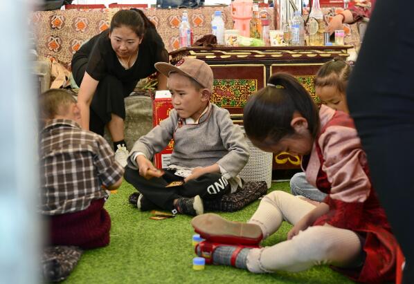 在日喀則市郊區的一個度假村,家長帶孩子在帳篷里“過林卡”(2019年6月23日攝)。新華社記者 張汝鋒 攝