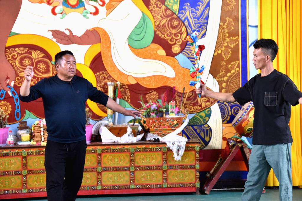 “在我們這里,人人都會表演藏戲,也喜歡看藏戲。”今年49歲的尼瑪次仁16歲就跟著師傅白瑪頓珠學習藏戲。作為“非遺”傳承人,他每天都要指導年輕人排練藏戲:“扎西雪巴藏戲的唱腔曲調和唱詞道白不同于其他藏戲,演員所戴面具為黃面具,內容分為出場儀式、正戲和結尾祝愿三個部分。”